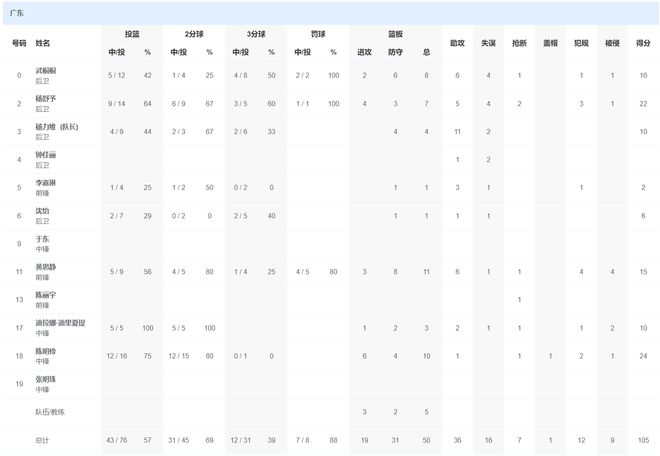 杨舒予此役33分钟,14中9,三分5中3,拿到22分7篮板5助攻4失误2抢断,命中率64.3%,三分命中率60%;