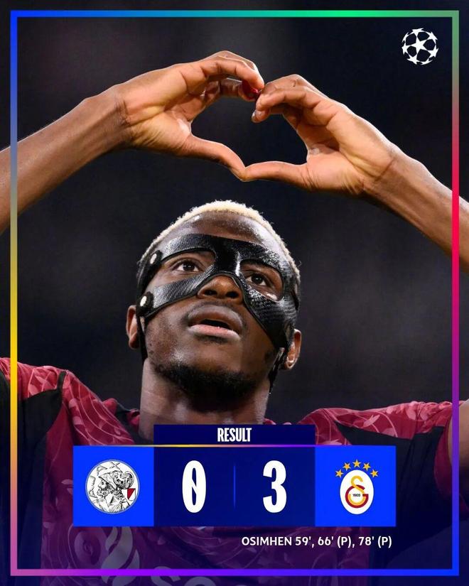 四届欧冠冠军得主被客场虫狂虐,奥斯梅恩大演帽子戏法,帮助加拉塔萨雷3-0大胜阿贾克斯。阿贾克斯开赛至今4战4负,打进1球狂丢14球,积分榜垫底。