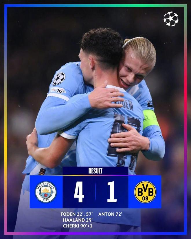 最终曼城4-1大胜多特,曼城4轮3胜1平不败,积10分暂居第4,多特7分第14。